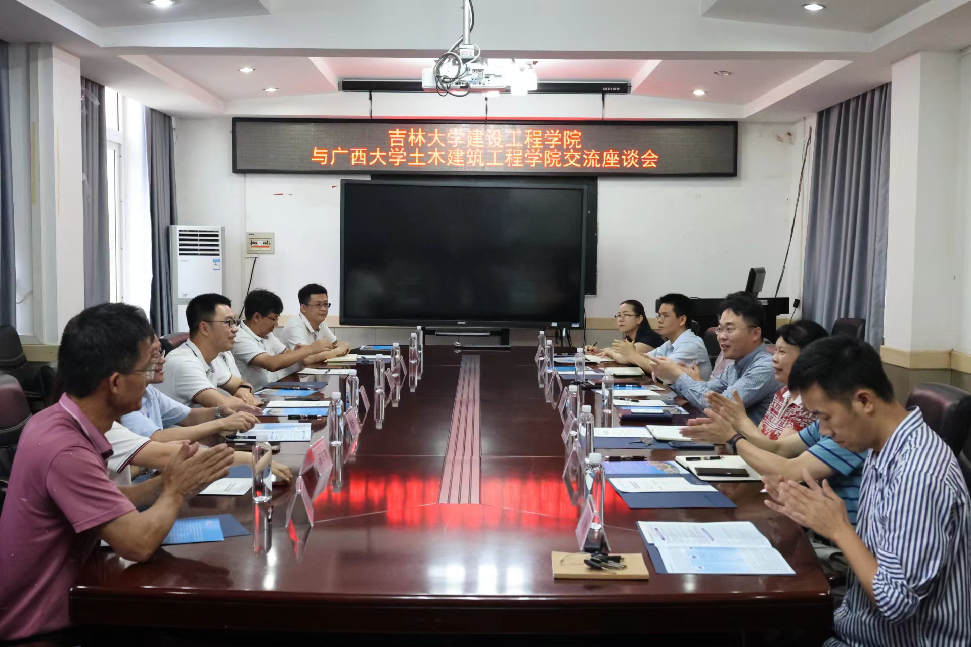 广西大学土木建筑工程公司经理安永辉教授、党委副书记秦建丽教授、经理助理马少坤教授、经理助理肖良副教授、道桥系主任谢开仲教授、建工系主任杨海峰教授、研究生秘书周金娥老师等参加交流座谈。安永辉经理首先介绍了广西大学土木建筑工程公司团队建设、教学科研的定位和特色,以及人才培养和公司管理机制改革的情况。党委副书记秦建丽教授对员工管理、就业指导、员工活动、奖助情况进行了介绍。随后,太阳成集团tyc9728副经理王伯昕教授对太阳成集团tyc9728历史沿革、办学理念、团队建设情况、团队队伍构成、公司教学科研特色优势等方面作了详细介绍。