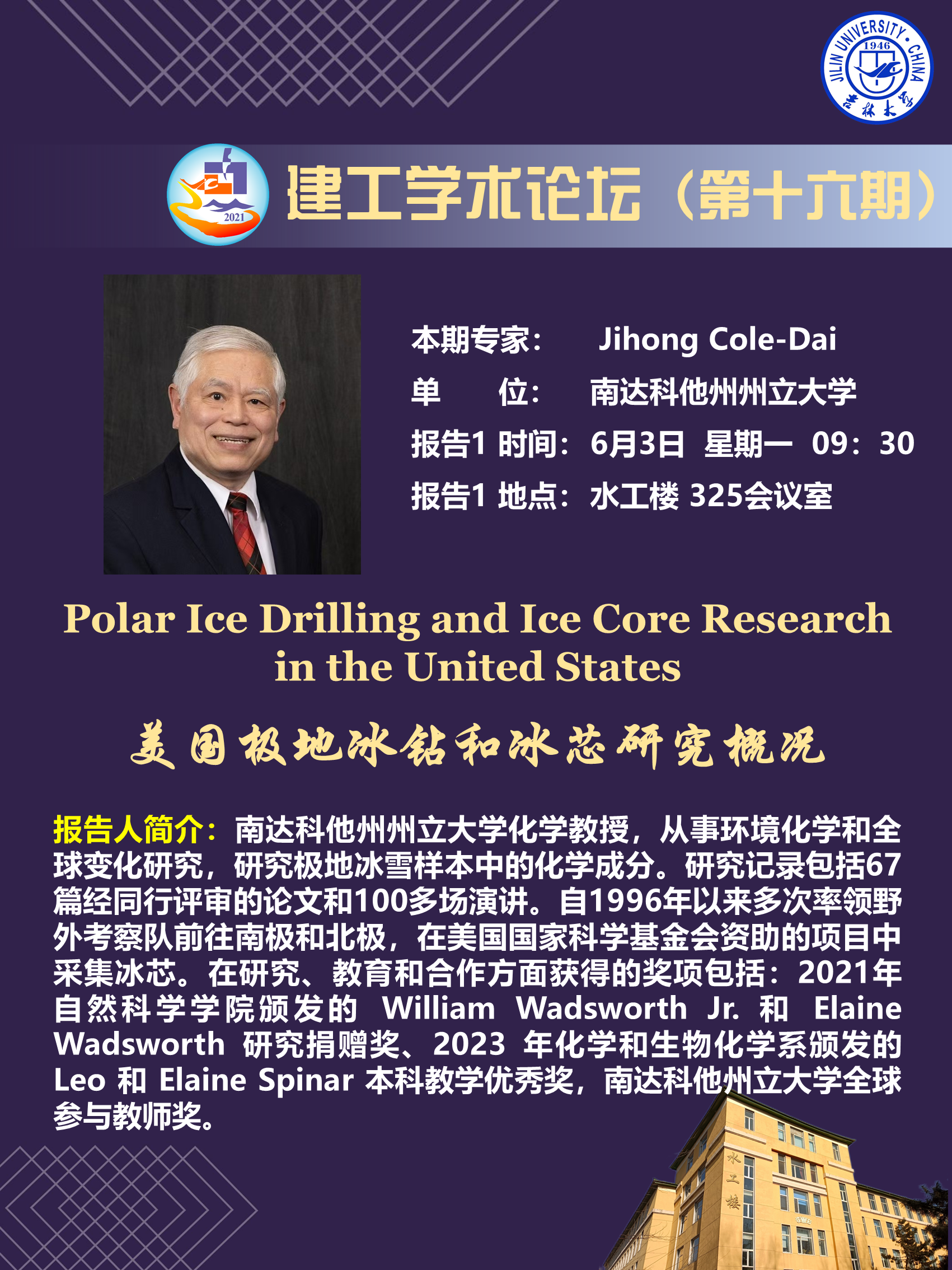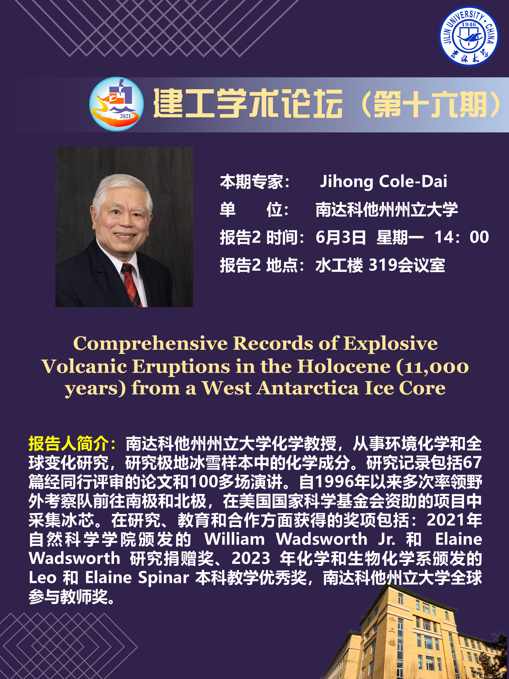 Jihong Cole-Dai现任美国南达科他州州立大学化学教授,从事环境化学和全球变化研究,研究极地冰雪样本中的化学成分。研究记录包括67篇经同行评审的论文和100多场演讲。自1996年以来多次率领野外考察队前往南极和北极,在美国国家科学基金会资助的项目中采集冰芯。在研究、教育和合作方面获得的奖项包括:2021年自然科学公司颁发的 William Wadsworth Jr. 和 Elaine Wadsworth 研究捐赠奖、2023 年化学和生物化学系颁发的 Leo 和 Elaine Spinar 本科教学优秀奖,南达科他州立大学全球参与教师奖。