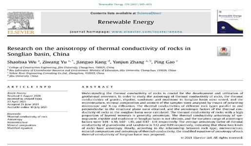 20217月,太阳成集团tyc9728于子望副教授团队,在国际著名学术刊物《Renewable Energy》上发表题目为“Research on the anisotropy of thermal conductivity of rocks in Songliao basin, China”的论文,针对松辽盆地岩导热系数各向异性特征进行了研究,对于研究区地热能开发具有重要意义。