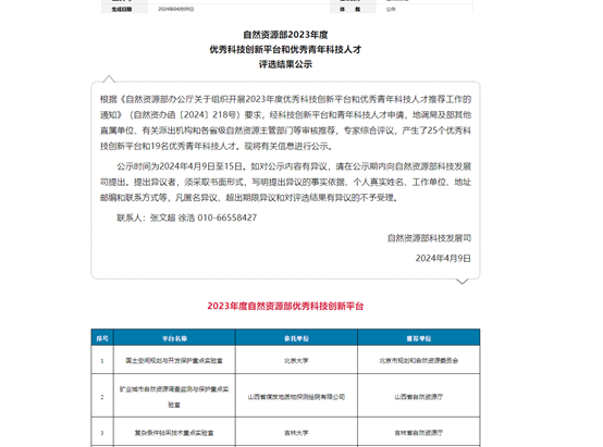 根据《自然资源部办公厅关于组织开展2023年度优秀科技创新平台和优秀青年科技人才推荐工作的通知》(自然资办函〔2024〕218号)要求,经科技创新平台申请,地调局及部其他直属单位、有关派出机构和各省级自然资源主管部门等审核推荐,专家综合评议,自然资源部复杂条件钻采技术重点实验室入选“自然资源部2023年度优秀科技创新平台”。