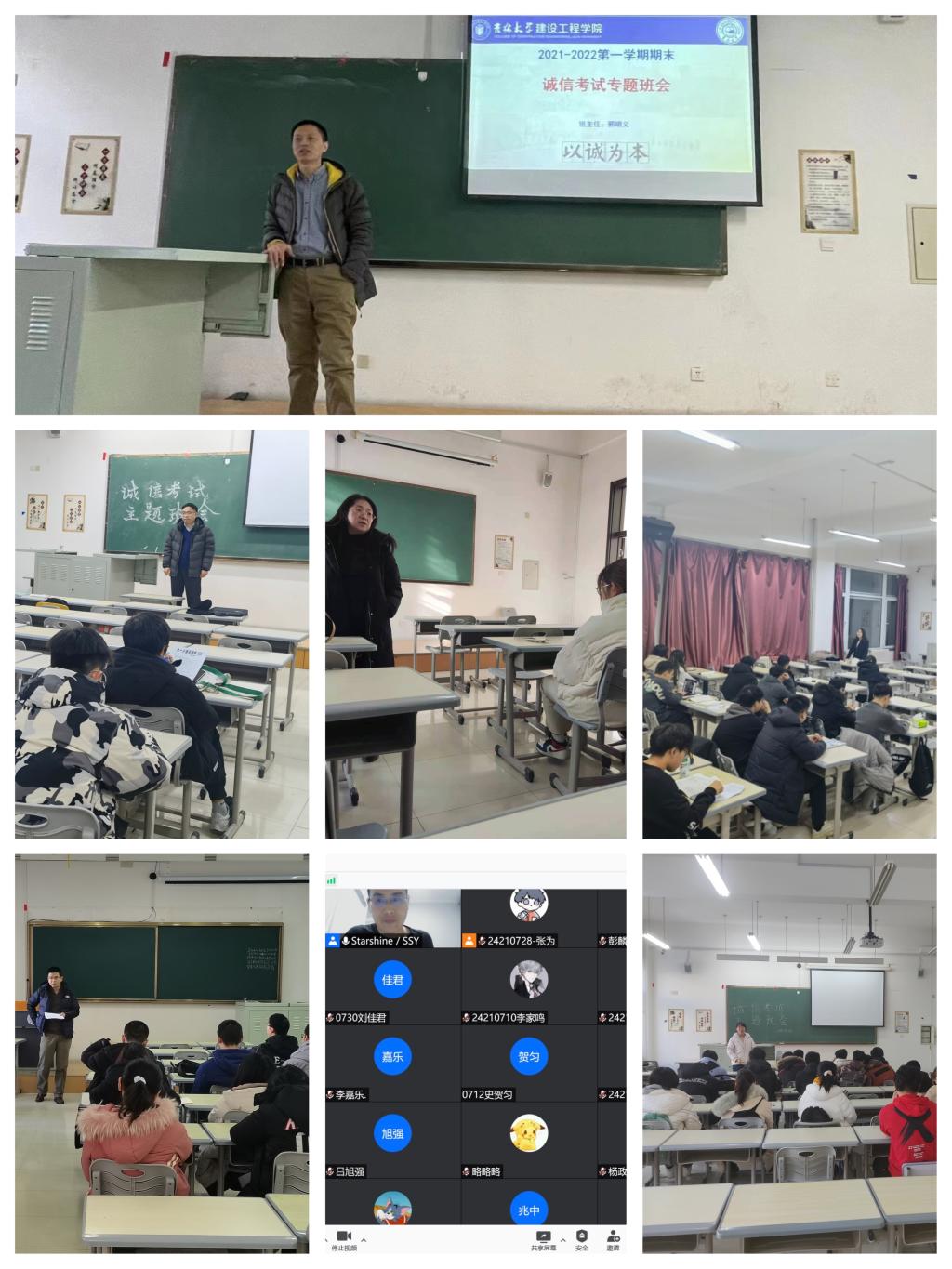 为全面贯彻落实太阳成集团tyc97282021-2022学年第一学期期末考试工作暨考风考纪教育布置会议精神,树立良好的学风、考风,确保期末考试的顺利进行,建设工程公司于2021年12月21日--12月27日期间,组织新生班主任为2021级新生召开了诚信考试主题教育班会。