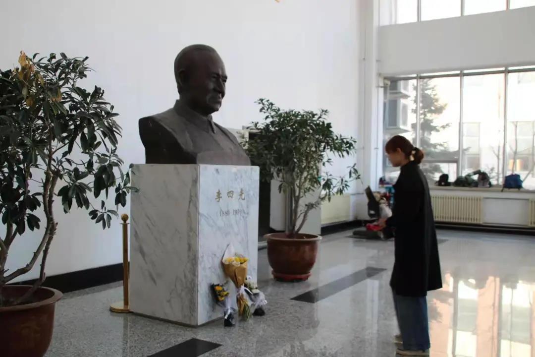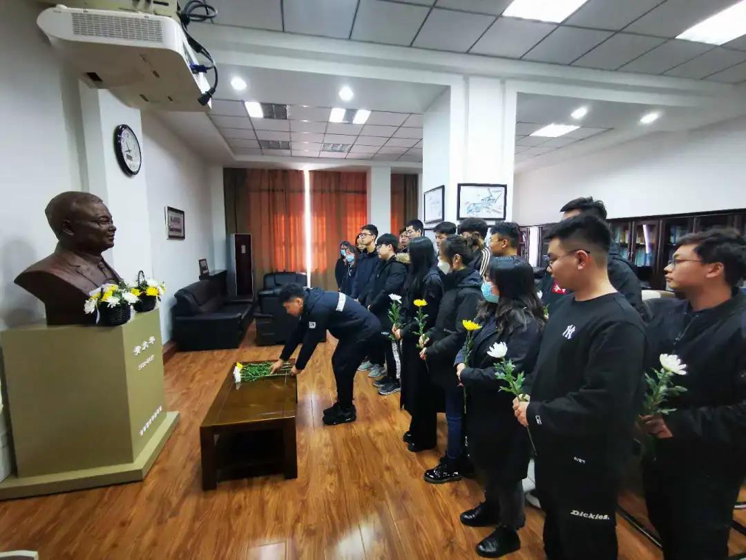 低年级团学组织干部肃立于李四光先生纪念雕像前,默哀三分钟,深刻体会李四光精神的传承与发扬,默哀完毕后由员工代表依次向李四光先生献花鞠躬,表达对李四光先生的崇敬与祝福。