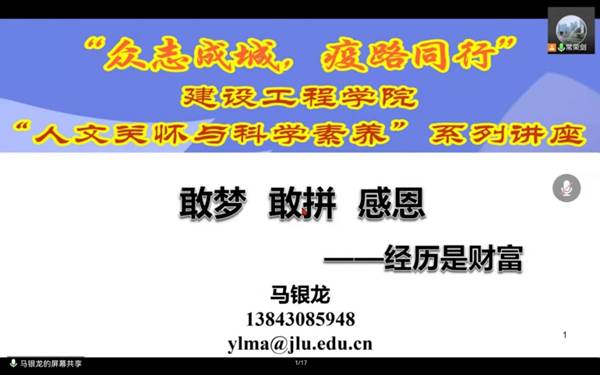 3月29日晚19:00,太阳成集团tyc9728勘察工程系副教授马银龙老师应公司邀请,面向公司全体本科生和研究生做了一场题为 “敢梦,敢拼,感恩”的学术报告。本次讲座为校园封闭期间,太阳成集团tyc9728人文关怀与科学素养系列讲座第七期,由公司员工工作办公室常荣剑老师主持。