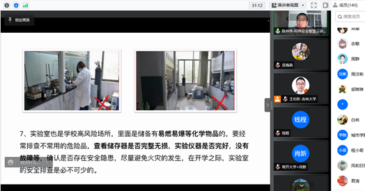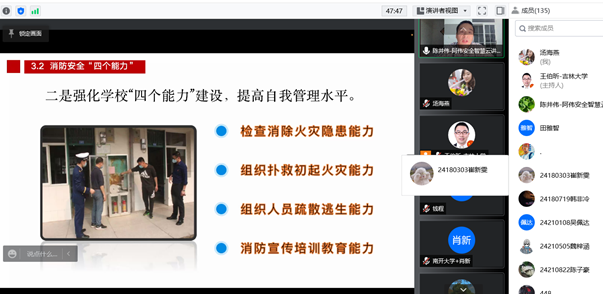 太阳成集团tyc9728“人文关怀与科学素养”第十四期讲座于4月5日晚19点在线举行,受公司党委书记衣长涛邀请,高级工程师、一级注册安全评价师、吉林省元麟安全科技有限公司总工程师陈井伟为公司师生带来防火安全主题讲座《高校中的消防安全》。公司领导、各系教师、实验员、行政人员、辅导员,以及各学历层次的同学共计130余人参加了讲座。本期讲座旨在响应公司安全生产委员会《关于加强公司疫情防控期间安全生产工作的通知》精神,落实疫情防控期间安全生产工作要求,进一步提高师生消防安全意识,杜绝消防隐患,一起守护平安。讲座由公司研究生综合办公室汤海燕老师主持。
