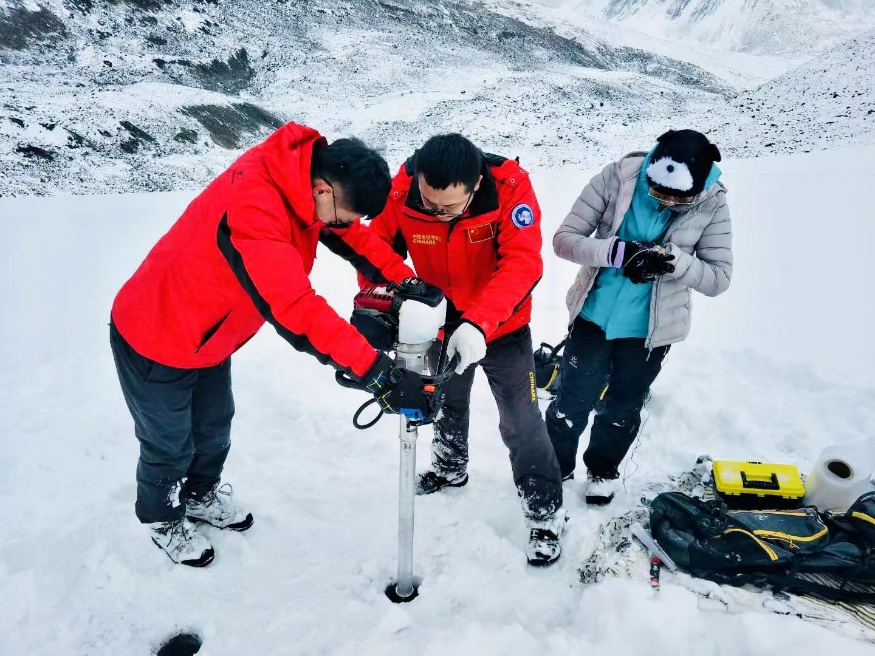 2019年10月,极地中心三名师生前往新疆维吾尔族自治区乌鲁木齐河源1号冰川进行了野外考察,顺利完成了手摇/汽油机浅层螺旋钻具野外测试,验证了钻具的可靠性和高山适用性,并采集了约12.4m冰芯,用于冰芯电导率、冰芯蠕变特性和微生物方面研究。