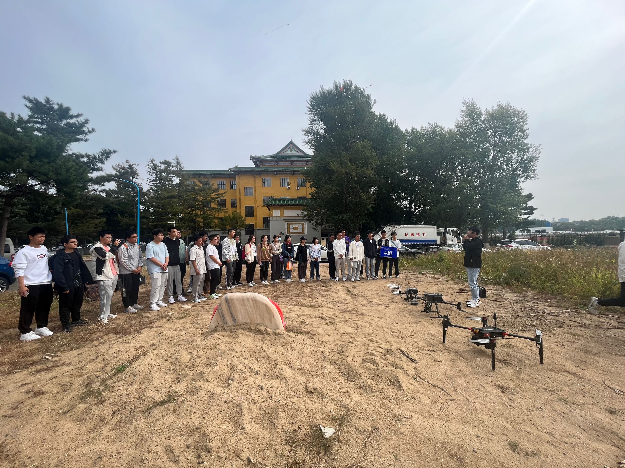 李玉超老师在黄大年楼奠基场地重点讲解了非接触式无人机测量在土木工程、地质工程专业测绘中的应用和发展,并介绍了公司配备无人机的类型、组成、结构、摄影方式和操作流程。此外,针对研究对象特点、环境复杂程度及野外作业的要求,讲解了不同型号无人机的优缺点及适用条件。
