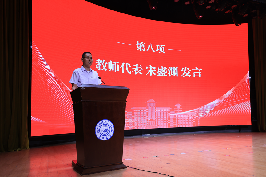 工程地质系宋盛渊教授作为教师代表发言。希望同学们要立鸿鹄之志,怀报国之心,深刻认识所学专业对国家发展的重要意义,将个人理想融入国家发展大局。要夯专业之基,求创新之道,扎实掌握基础知识,培养严谨细致的工程思维;主动学习前沿技术,成为适应行业变革的复合型人才。要惜青春之时,拓综合之能,要在刻苦学习之余,培养综合能力,实现全面发展。