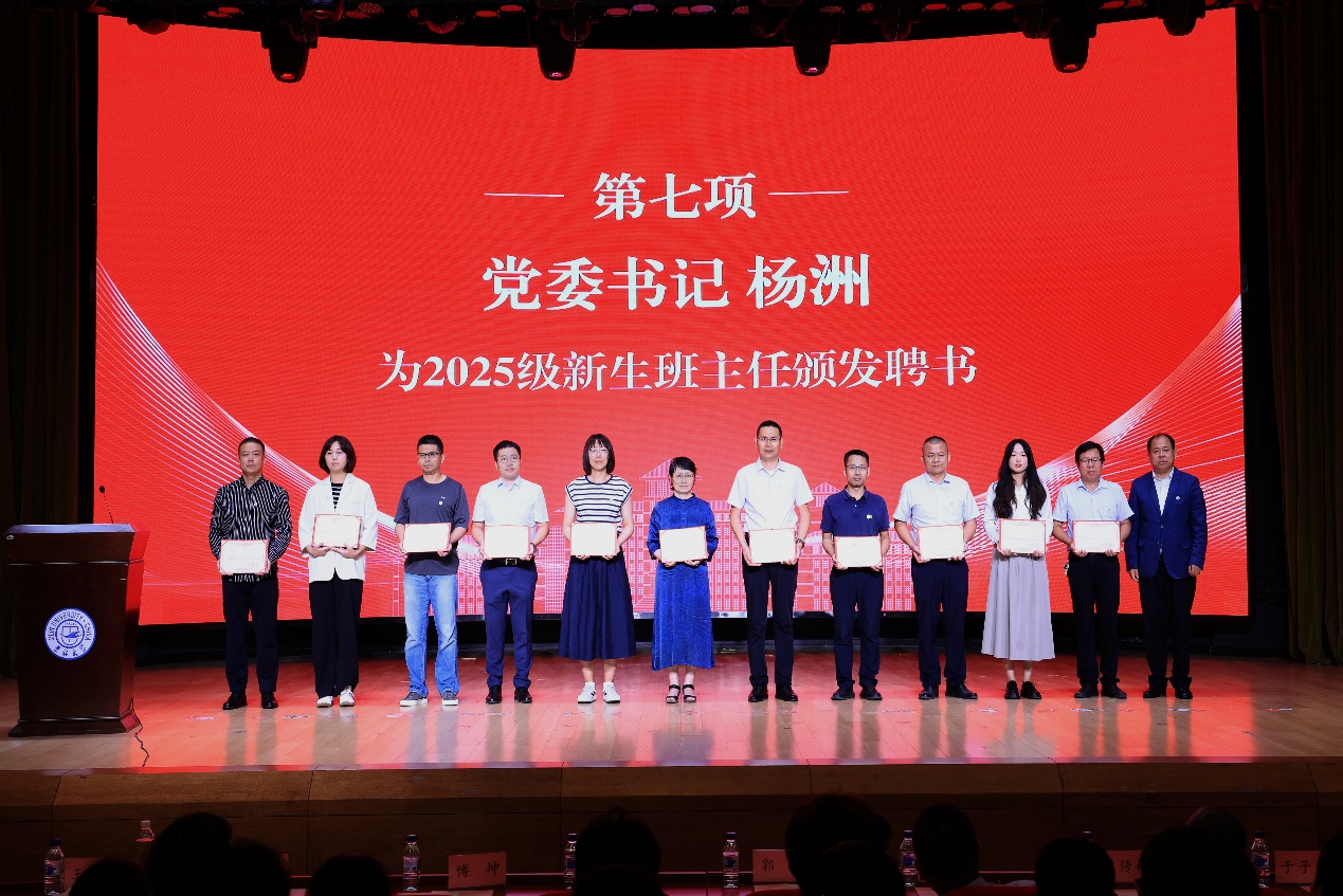 会上,副经理博坤宣读《关于聘任于子望等11名教师担任2025级新生班主任的决定》,党委书记杨洲为全体新生班主任一一颁发聘书,希望他们甘于奉献,尽职尽责,争当“四有好老师”、争做“四个引路人”,以高质量人才培养无愧于教师神圣使命。