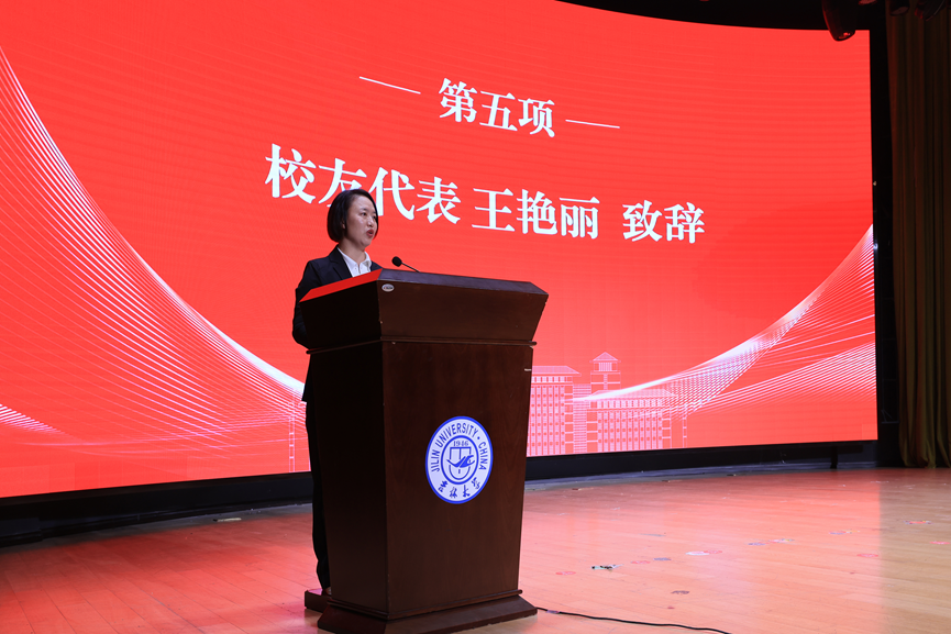2005届本科毕业生、中国地质调查局勘探技术研究所正高级工程师王艳丽,作为员工代表在典礼上致辞。她深情回顾了在母校的求学岁月,结合自身参与国家地质勘探工程的亲身经历,激励同学们要夯实专业功底、培养创新思维,树立“上天入地”的信念,锻造“登峰造极”的本领。把“专业信念”扎深,扛得住“路途中的颠簸”;把“校园收获”练实,接得住“工作里的挑战”,把“眼界放远”,在“平凡里看见不凡”。希望大家在智能建造、绿色建筑等行业新赛道上勇担使命,以建工人的专业力量助力国家重大工程建设。