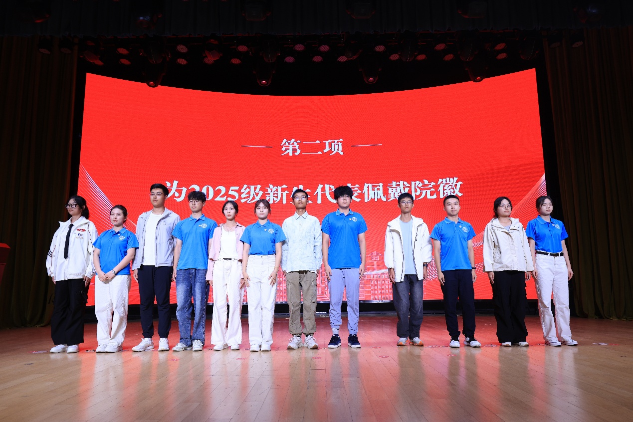2025级新生佩戴院徽仪式在典礼上举行,高年级员工为新同学代表郑重佩戴院徽,象征着他们正式成为光荣的“建工人”,时刻提醒他们不忘砥砺求学初心,牢记工程报国之志。