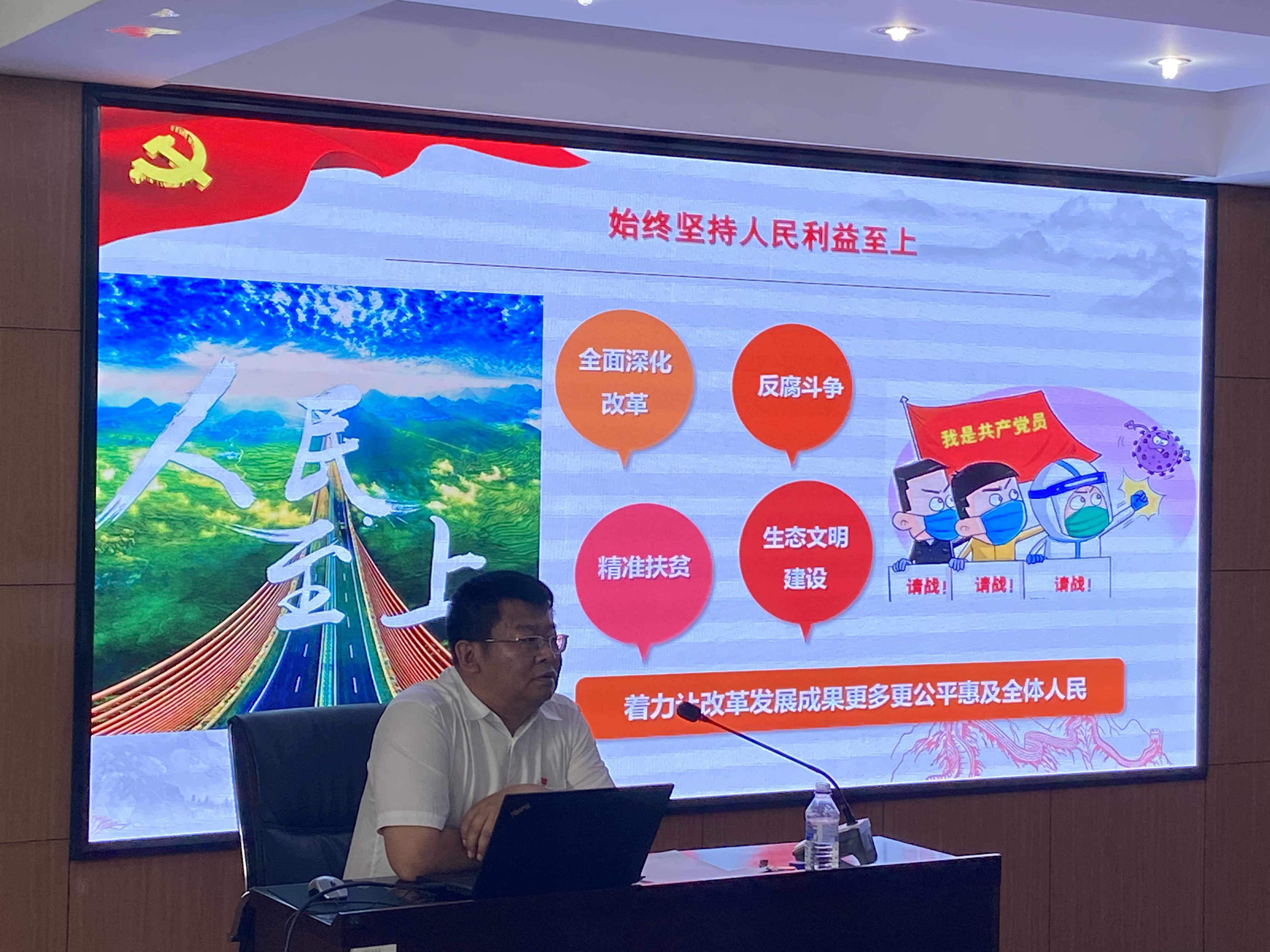 党委书记衣长涛传达了党史学习教育的重要意义,带领员工党员回顾了中国共产党的历史。从嘉兴南湖的小渔船到今天的航空母舰,从50多人的小党到今天拥有9000多万党员的百年大党,中国共产党的发展历程不是一帆风顺的。其中长征中的湘江战役,一场战斗就牺牲了3万余人,异常惨烈,抗美援朝出兵作战牺牲36.6万人,党和军队付出了巨大的牺牲。历时百年,在中国共产党的领导下,党的面貌、国家的面貌、人民的面貌、军队的面貌、中华民族的面貌发生了前所未有的变化。