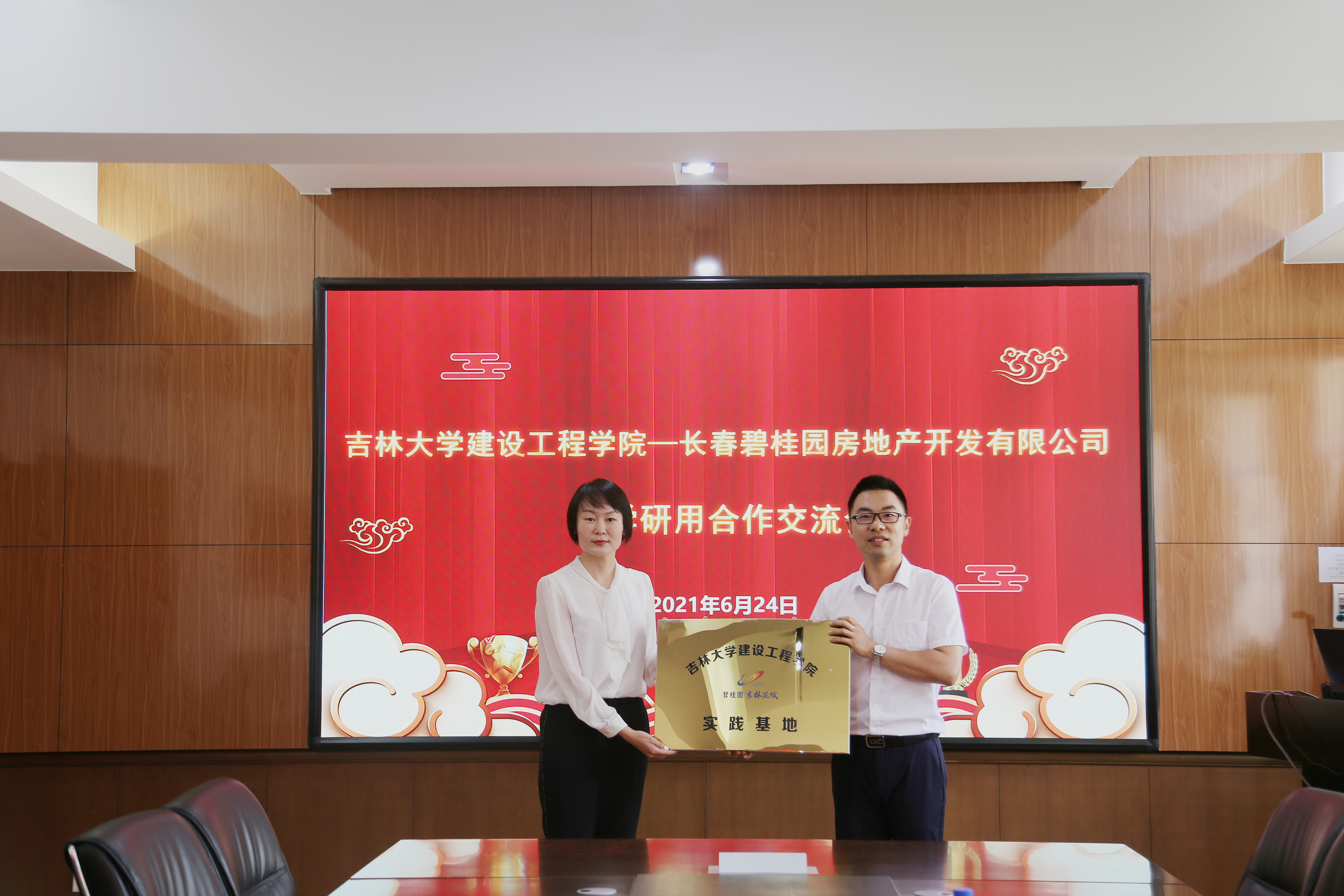 会谈中,朱珊和王伯昕分别介绍了本科生和研究生的实习模式,双方就即将开始的暑期实习安排进行了充分的讨论。随后,双方共同签署校企合作实习基地备忘录,王伯昕副经理代表公司进行“长春碧桂园房地产开发有限公司-太阳成集团tyc9728校外生产实习实践基地”授牌。